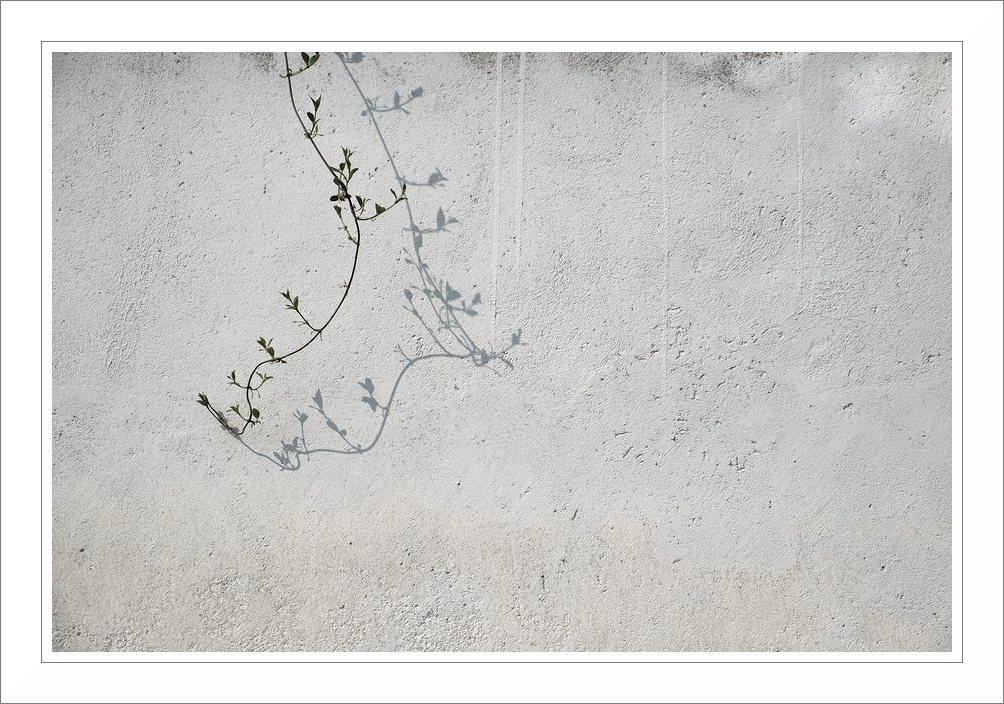 Molto bello questo minimal.Sul materico muro si disegna la lieve ombra del giovane rametto.Ottima la composizione e la gestione del bianco. Ciao
