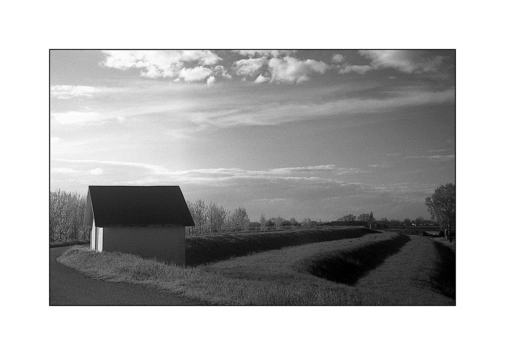 Stupisce il grande rigore compositvo, e la spigolosià della linee e delle forme protagonite a colmare tutta la inquadratura, mentre lo scenario ha però una affasciannte morbidezza, che nega in singole parti una materiticià di dettagli che magari ti attendereti da altri strumenti fotografici o altre atrezzature, ma che qui è quasi un dono in più, una nota di vaga irrealtà , che rende il tutto speciale. Dolcezza del disegno leggero delle nuvole chiare, una ghiaino sulla curva di strada che non ha una realistica durezza che porebbe magari scontenare lo sguardo, mentre l'erba nel campo ha una leggibilità reale e