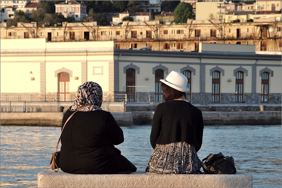 Due figure vagamente straniere riprese in un momento di riflessione o conversazione, spiccano in modo divertente le dimensioni rispettive delle due borse, veramente ai limiti del comico, con tutto il rispetto.
