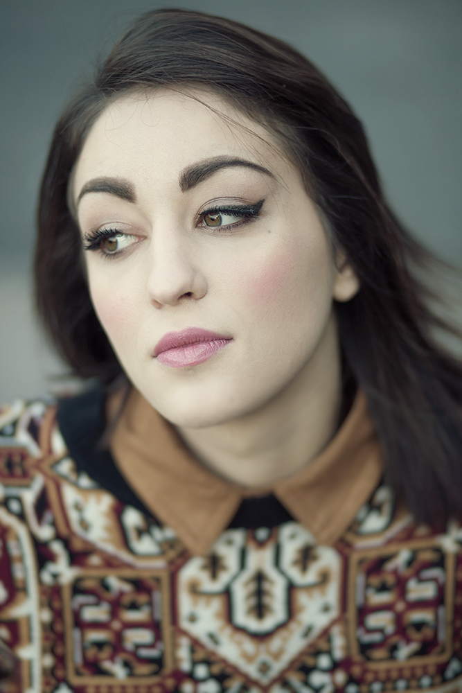 Sensazioni soltanto, sia inteso: il disegno del maglione è caratteristico ed un po' prepotente, e la larghezza relativa del busto ripetto al volto, con questo taglio, crea una impercettibile sproporzione volto figura. Ma ci scordiamo tutto arrivando al volto, con uno sguardo pensoso ma supervivo, mentre l'incarnato ha la dolcezza liscia ed impalpabile, malinconica nella tinta, di un trucco da palcoscenico. La curva della ciocche lisce è una carezza visiva, addolcisce, accompagnandola, la lieve inclinazione del viso, tutto rivolto ad un distante grumo di pensieri.