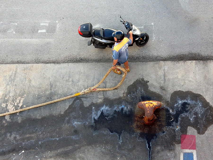 Sembra quasi che voglia assicurare lo scooter a quella grossa gomena!Ottimo punto di ripresa e belle le corrispondenze cromatiche giallo-rosso-blu.Precisa anche la composizione di questa piacevolissima immagine. Ciao
