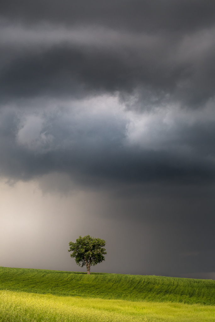un cielo minaccioso regala una bellissima luce che illumina l'alberello solitario e colora il prato di un verde brillante. Mi piace molto