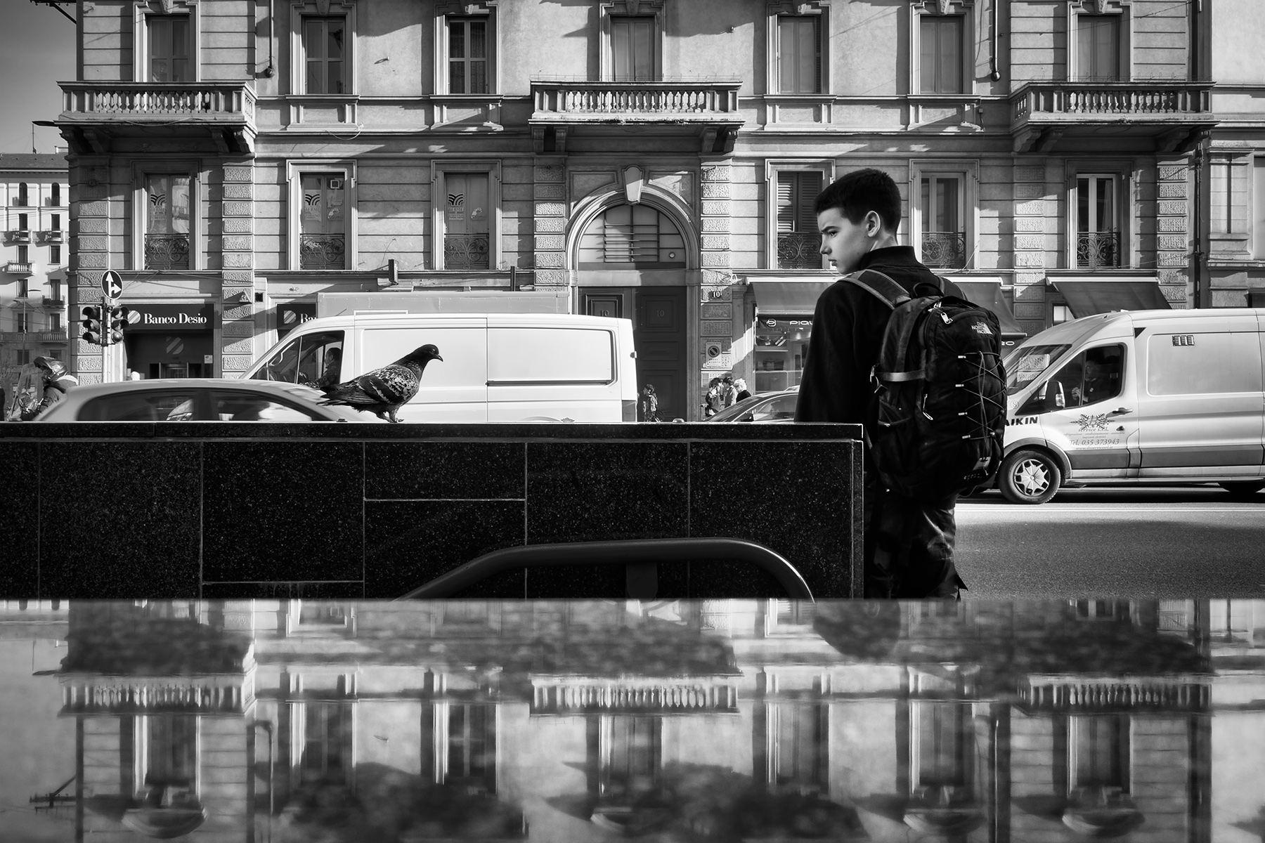 Iniziamo dal contenuto: Il centro di interesse della fotografia è un piccione immobile su di un muretto cittadino. Ci guida il forte contrasto fra l’uccello e lo sfondo bianco del furgone. Poi lo sguardo rimbalza fra i grigi del palazzo superiore e il riflesso inferiore per poi andare sul furgone alla destra dell’inquadratura. Solo più tardi si realizza lo sguardo del ragazzo verso il piccione che comunque rimane forzato, silenzioso e banale. Il riflesso in una fotografia ha un peso importante, specie se messo alla base dell’inquadratura ed occupa quasi un terzo di quest’ultima. Non si riesce a capire il perché della sua importante presenza.