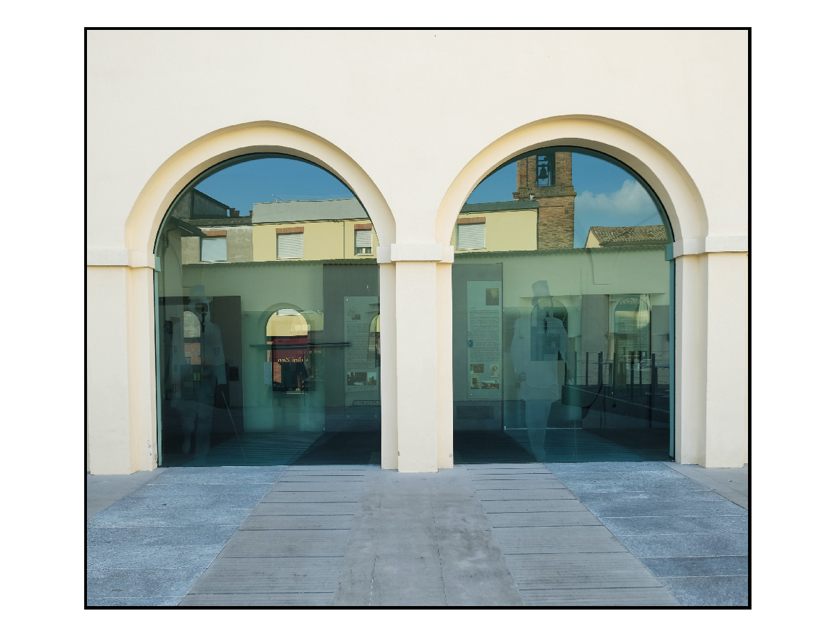 Mi piace con il riflesso che crea un paesaggio e questo fantasma che aleggia tra le mura della fondazione. Secondo me è un po' da raddrizzare.