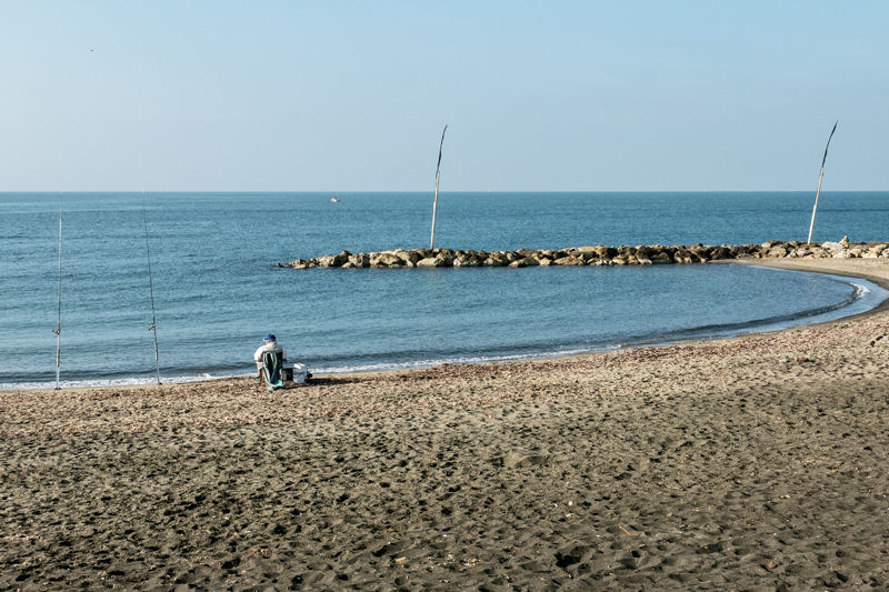 La composizione è buona, il pescatore sul punto forte, orizzonte e linea della battigia sui terzi.