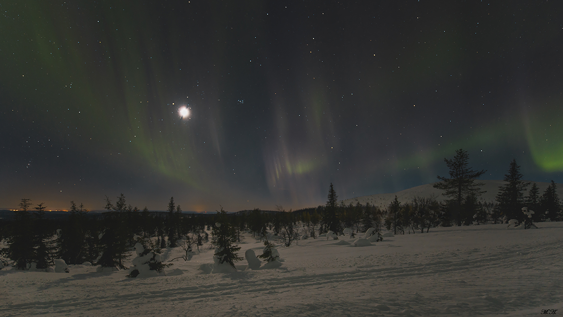 La luna era abbastanza potente e solitamente interferisce non poco sulla visibilità dell'aurora, ma in questo caso l'indice di attività geomagnetica era alto e c'è stato un equilibrio assoluto tra le due fonti di luce, riflesso alla perfezione dalla neve. Era notte ma sembrava giorno, con una luce surreale che solo quelle latitudini e quei paesaggi sanno restituire.