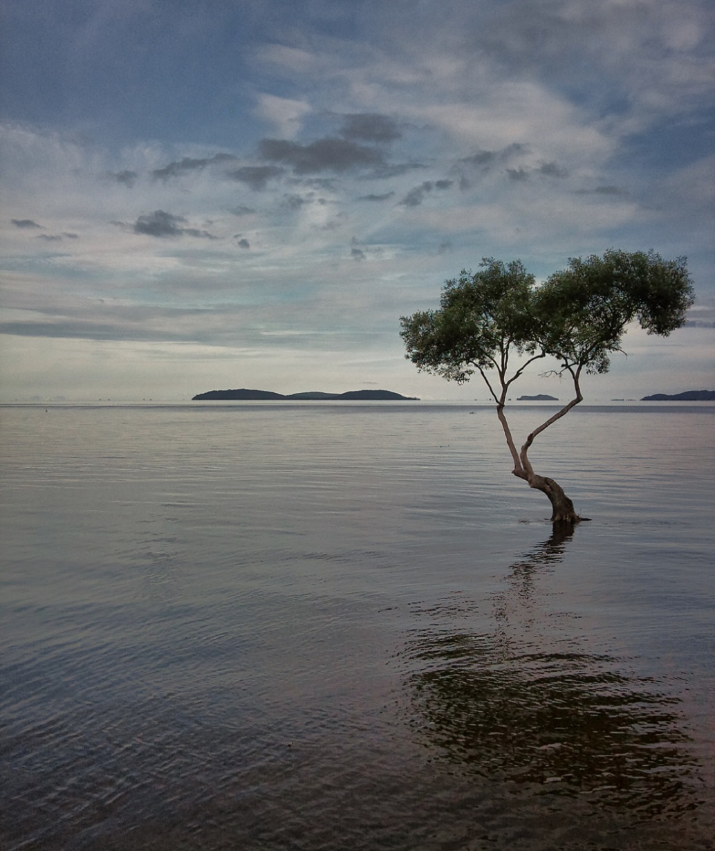 In realtà a me piace molto anche così, nonostante le preziose considerazioni sulle spazi compositivi che la foto ha stimolato. Parrebbe leggermente sottoesposta, mentre invece per me è crepuscolare al punto giusto, tanto da poter apprezzare le minime sfumature luminose di rosa che si palesano nell'acqua. E da assecondare la atmosfera lievemente malinconica della solitudine contorta dell'albero , nella vastità della scena. Ma la bellissima replica ombrosa di lui è tutta intera fra le ondine, e parte, serpeggiando ,esattamente dall'angolo inferiore destro. Davvero bella.
