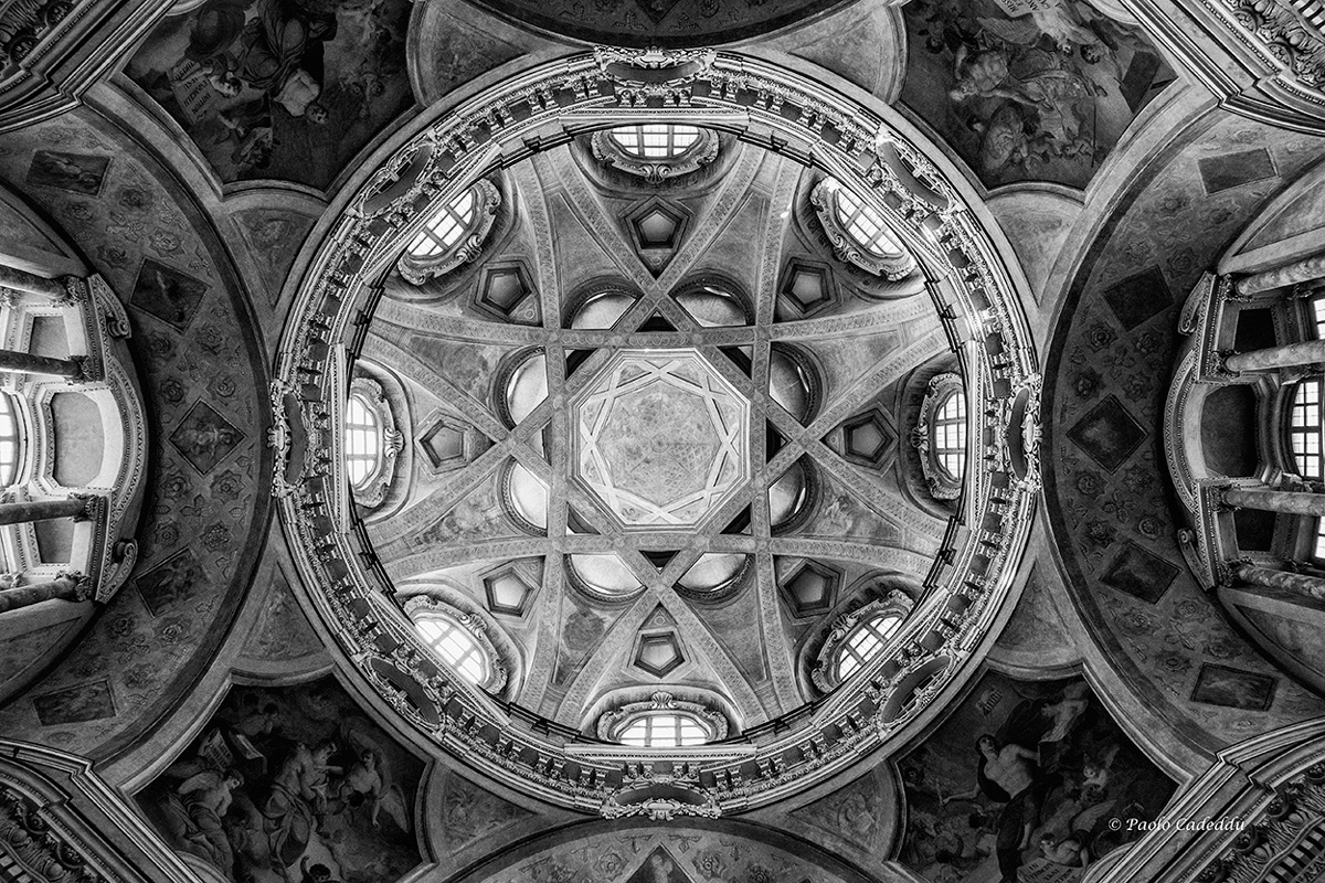 Ottima ripresa a testa in su, ben inquadrata e confezionata. Non centratissima, ma sufficientemente precisa. La conversione in BN complessivamente mi piace, proverei solo ad abbassare leggermente le luci e contrastare un po' nel disco centrale della cupola, così da renderlo più leggibile e tridimensionale. Ho fatto un tentativo e per i miei gusti risulta più efficace.