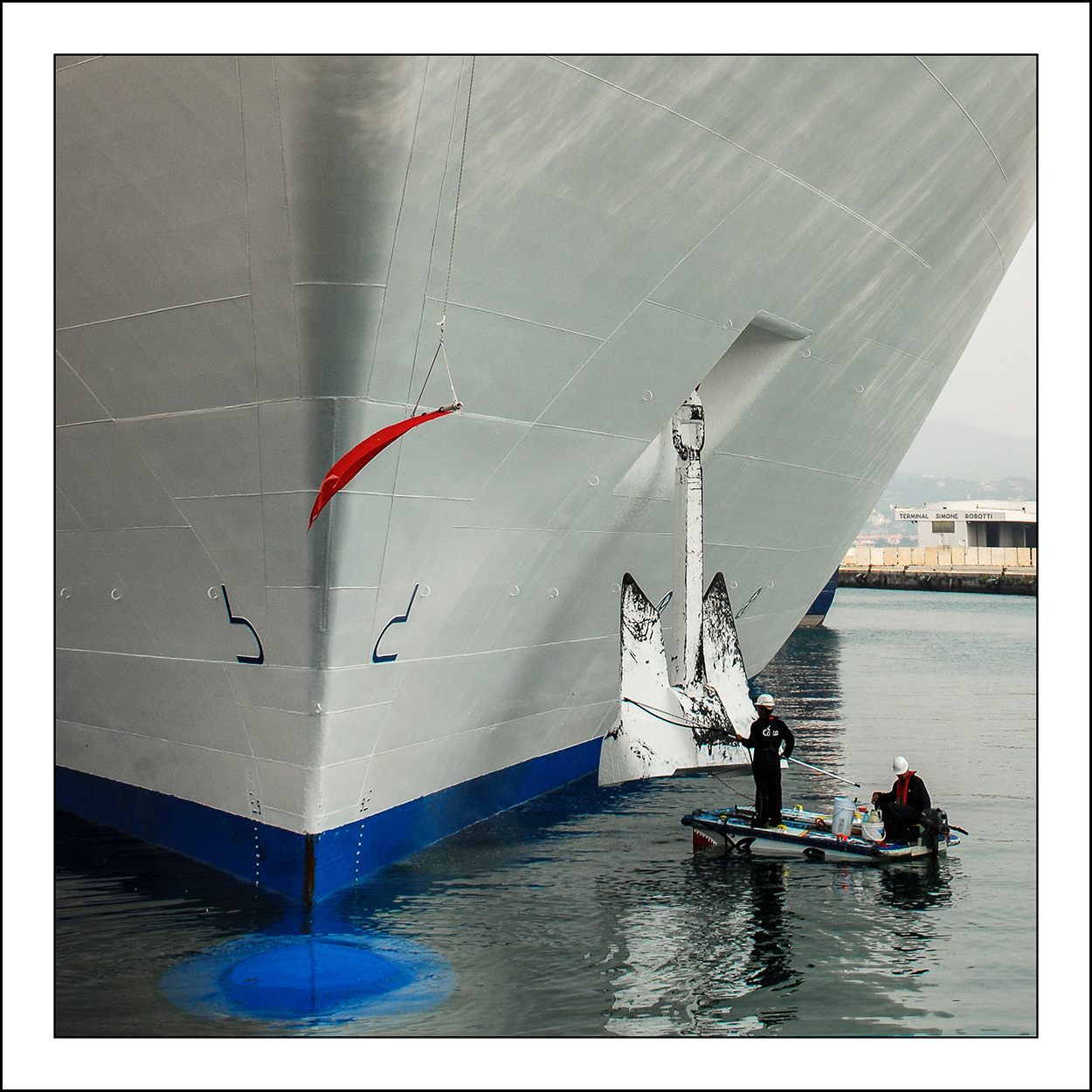 Bella composizione nel formato quadrato.Immagine che trova il suo punto di forza nella sproporzione tra gli uomini al lavoro e l'imponenza della nave e dell'ancora.Mi piace anche quella pennellata di rosso della bandiera che segnala i lavori in corso.Ottima.