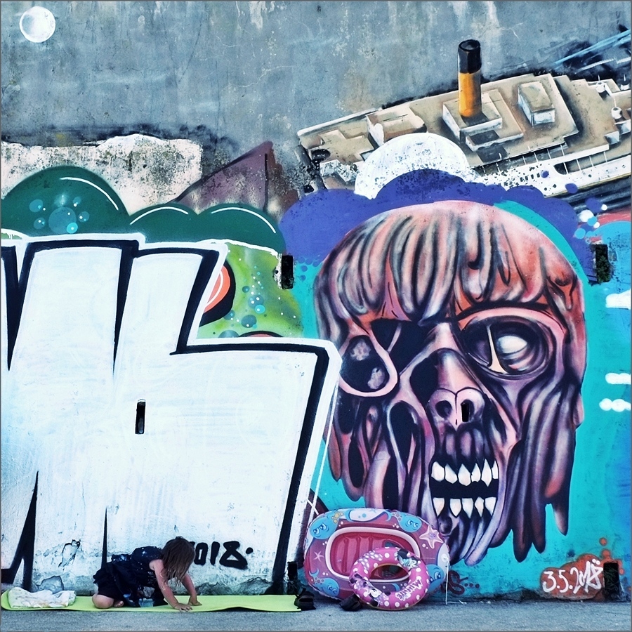 Bellissimo il momento colto, il canosino che riprende i colori del murales che è alquanto inquietante, quanto invece è dolcissimo il movimento della bimba che si appresta con il suo telino ad un momento di riposo!!! Ciao