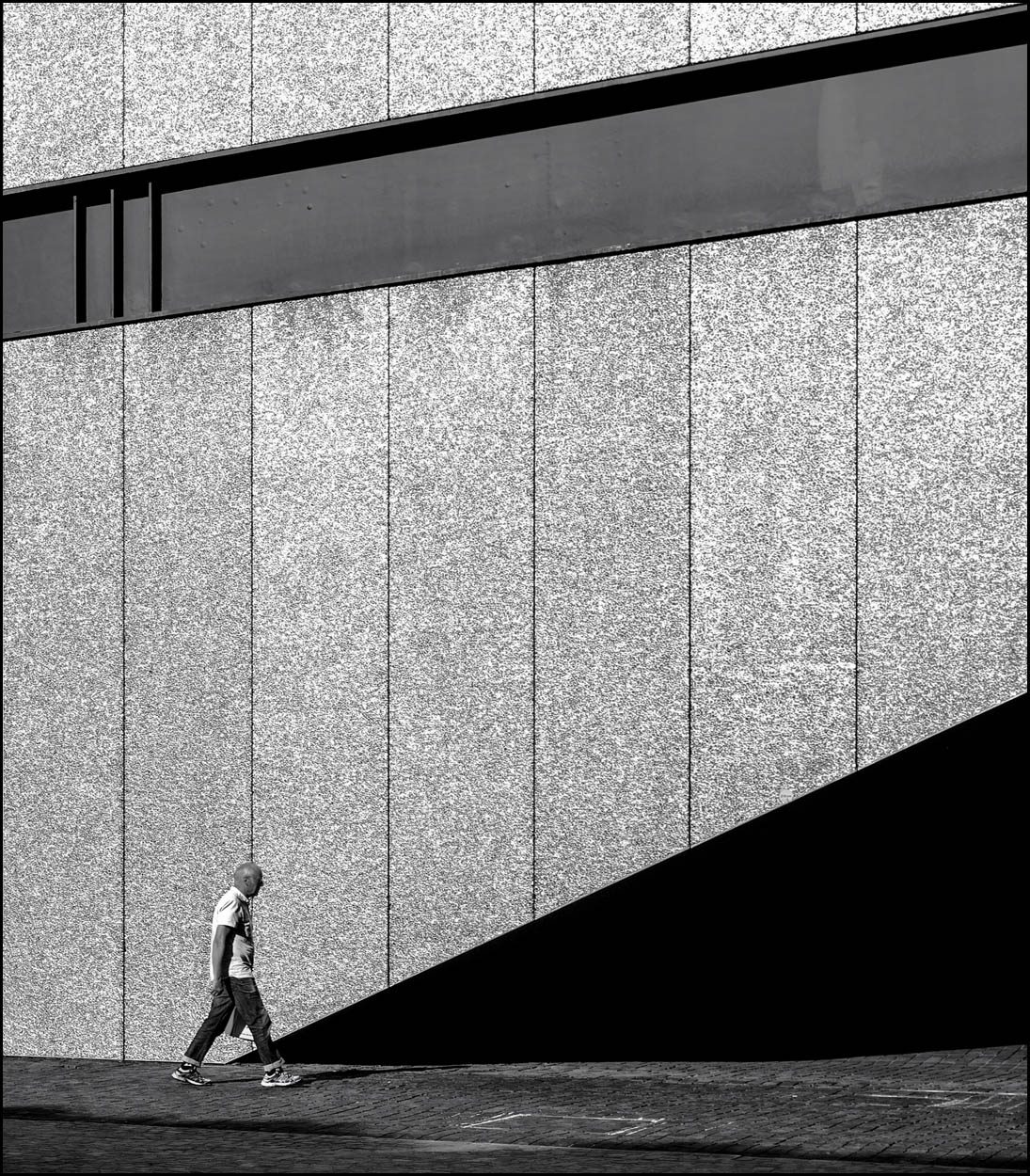 Mi piace moltissimo la sottile ombra dell'omino , che osa toccare il grande triangolo di nero, sporcare appena la integrità , che qusi incute timore, della geometria d'ombra che sta per sorpassare.