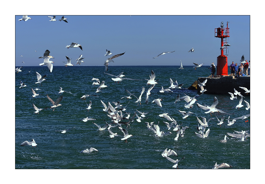 Un folto stormo di gabbiani, praticamente all' arembaggio . Una bella scena, ricca di naturale dinamismo.