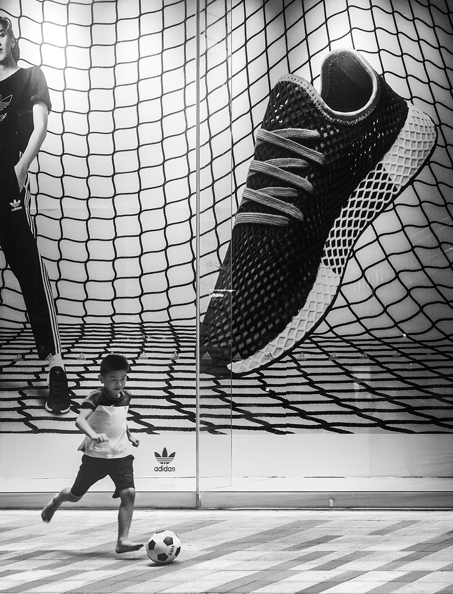 ancora una proposta di pregio, mega cartellone pubblicitario di calzature sportive ed il bambino che gioca scalzo.