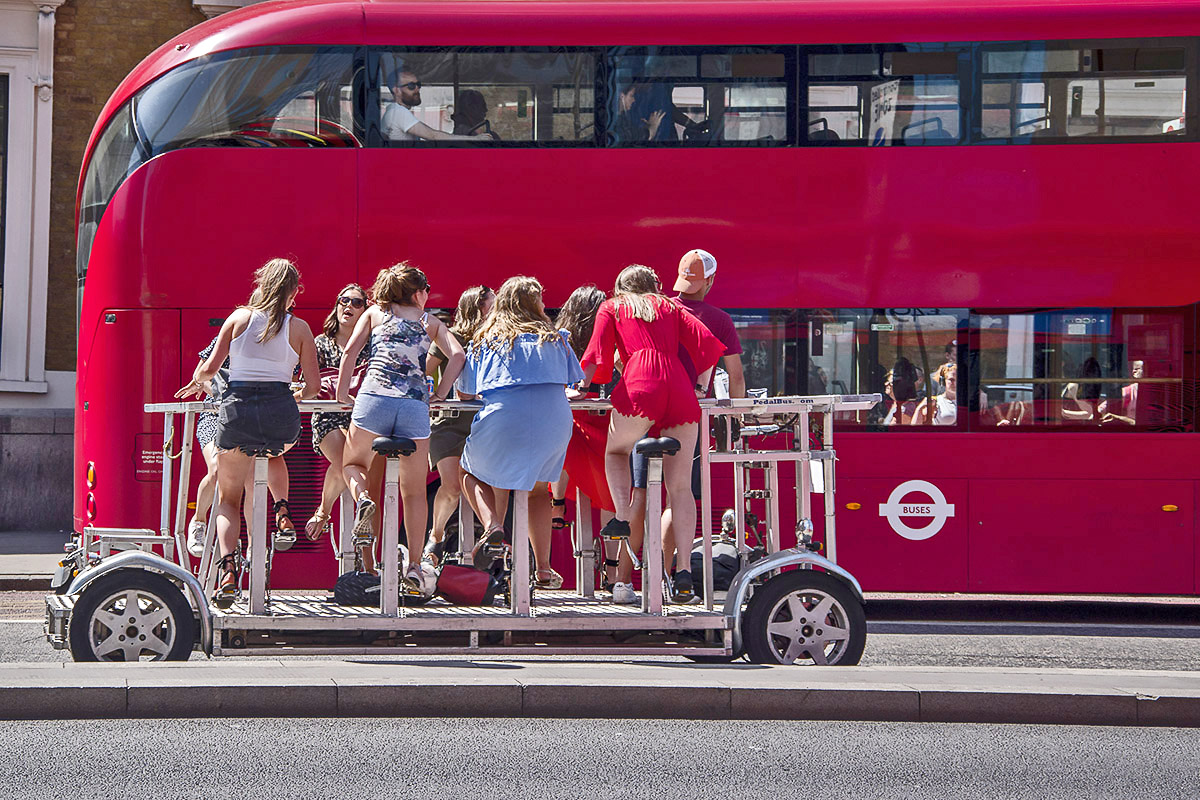 Auto bici a due file autobus a due piani, rosso su rosso del vestito. Una foto simpatica e ben riuscita, sicuramente inusuale.