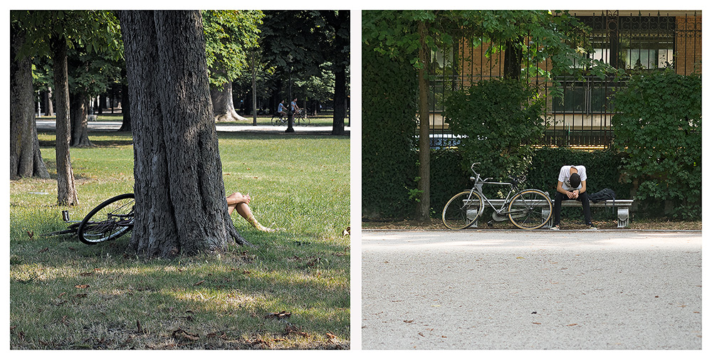 Pensieri e biciclette al parco. Bel dittico pure questo, ma ha differenza del precedente lo avverto meno omogeneo per via dei colori e toni molto diversi tra loro.