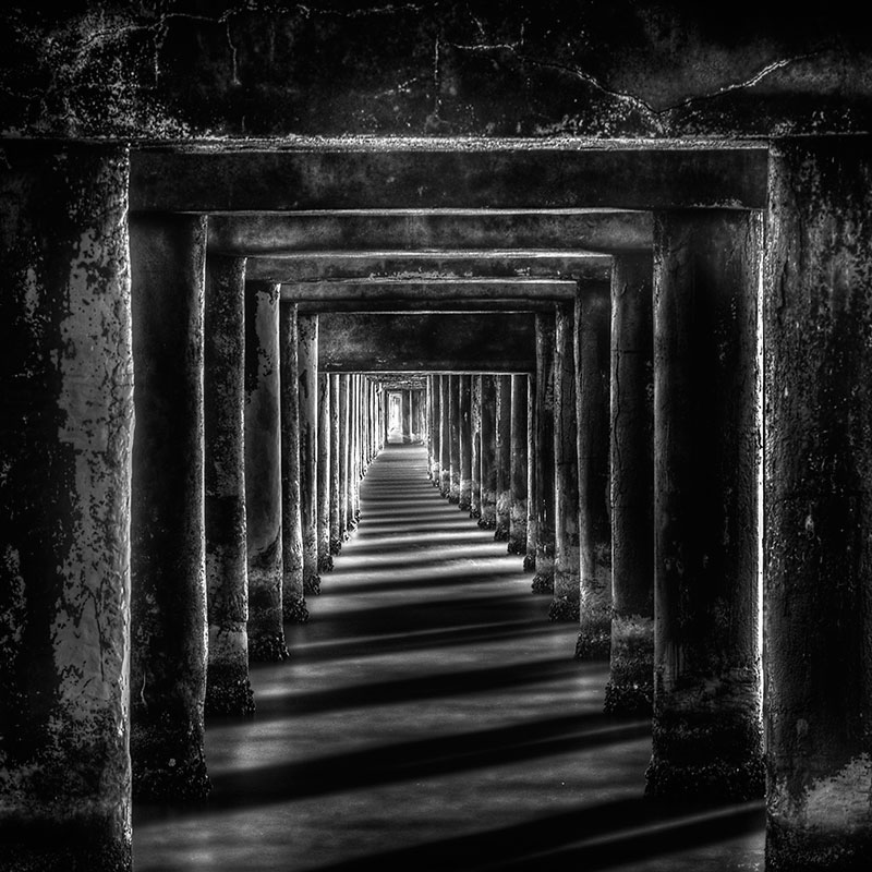 Immagino sia la base di un pontile ripresa con tempi abbastanza lunghi. Una bella immagine, grande profondita' e buono il Bn . Splendido il gioco di luce e le linee create dai chiaroscuri.