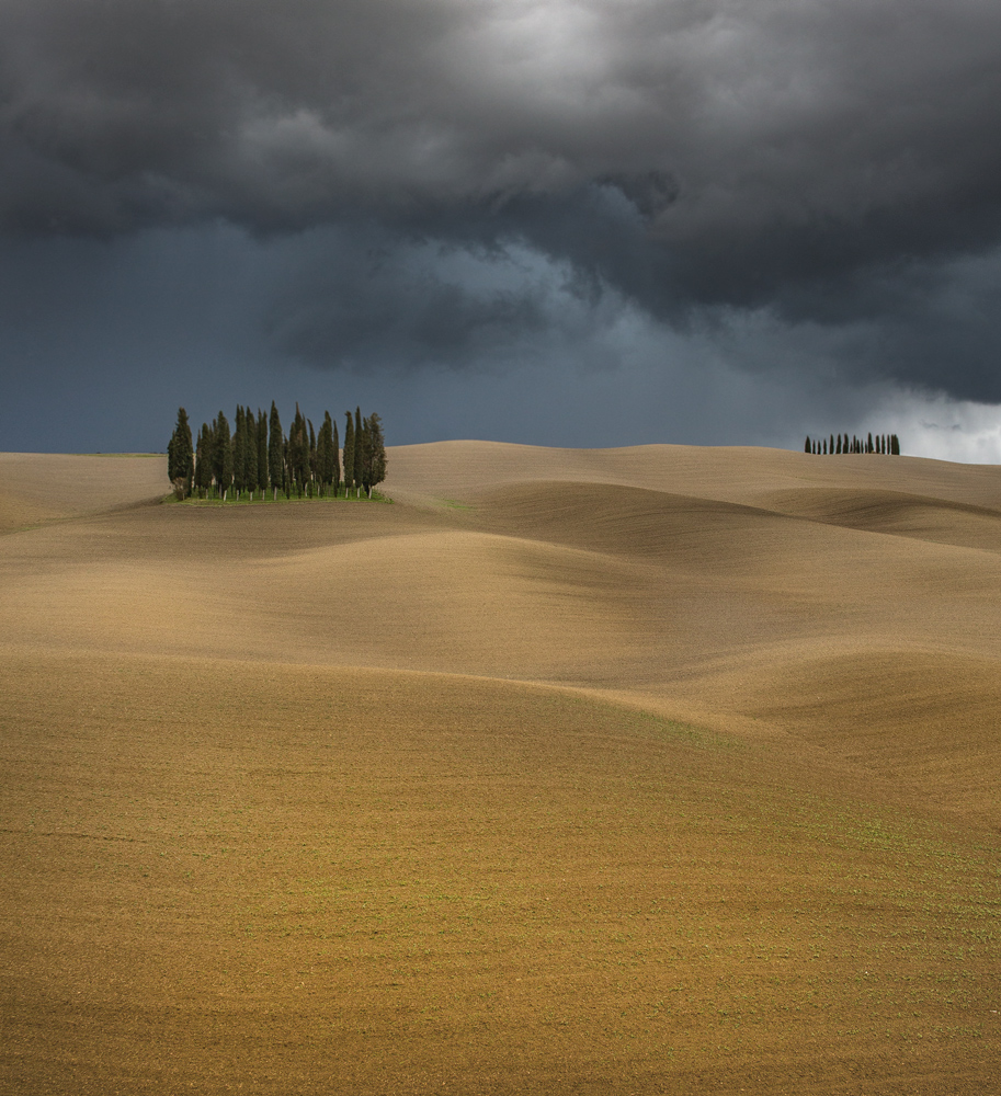 nuvole minacciose incombono sulle morbide colline punteggiate da cipressi regalando un'atmosfera irreale. Mi piace molto