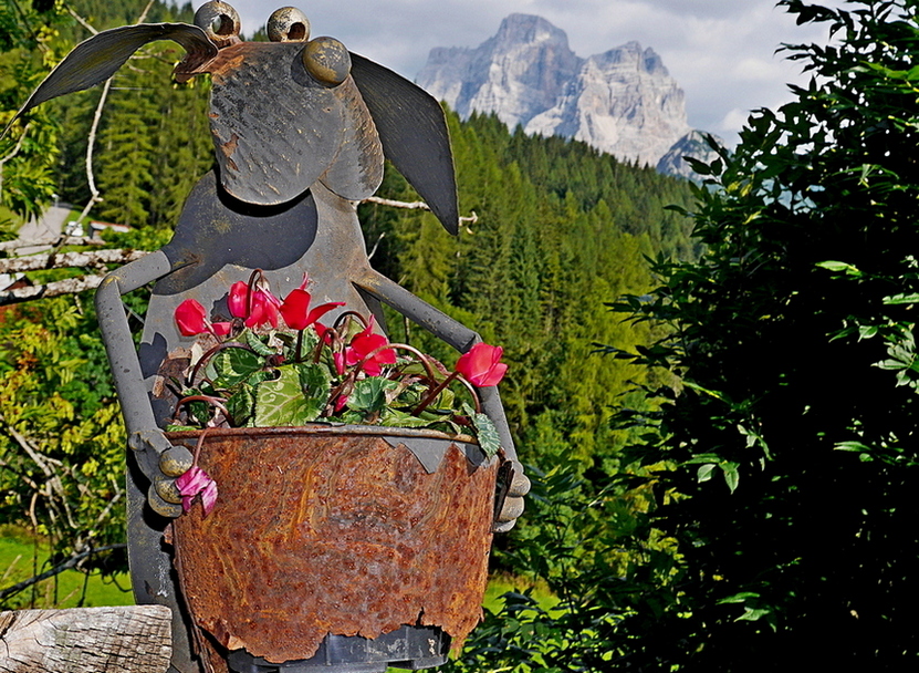 sono invece meno in sintonia sul fatto di riprendere SOLO il "cane" dal momento che non avrebbe avuto piu' il senso che volevo dare ( avevo gia' in mente cio' che volevo realizzare) quella figura in lamiera mi serviva quale ironico elemento atto a "presentare" il suggestivo panorama....porgendo dei fiori..