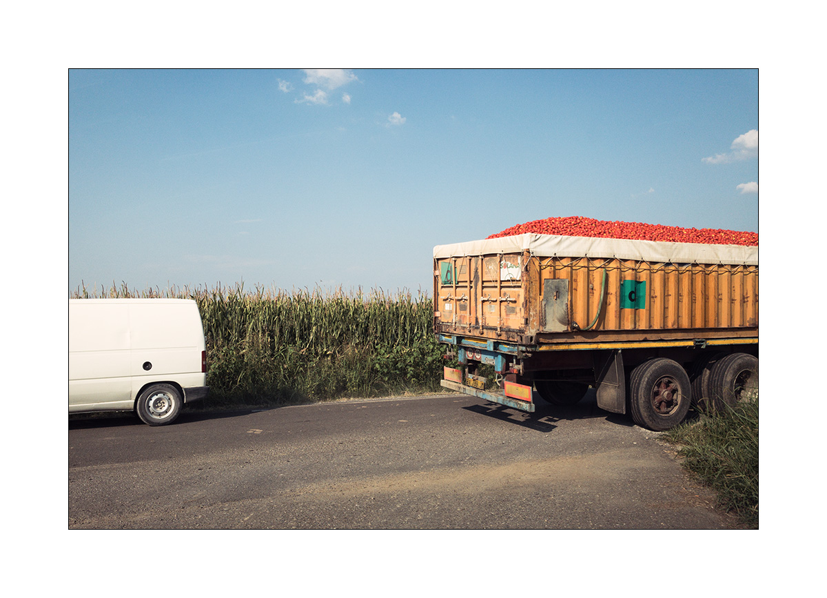 i tuoi paesaggi, di solito deserti, questa volta animati da mezzi di trasporto sulla stretta stradina. Un'originale e interessante variazione