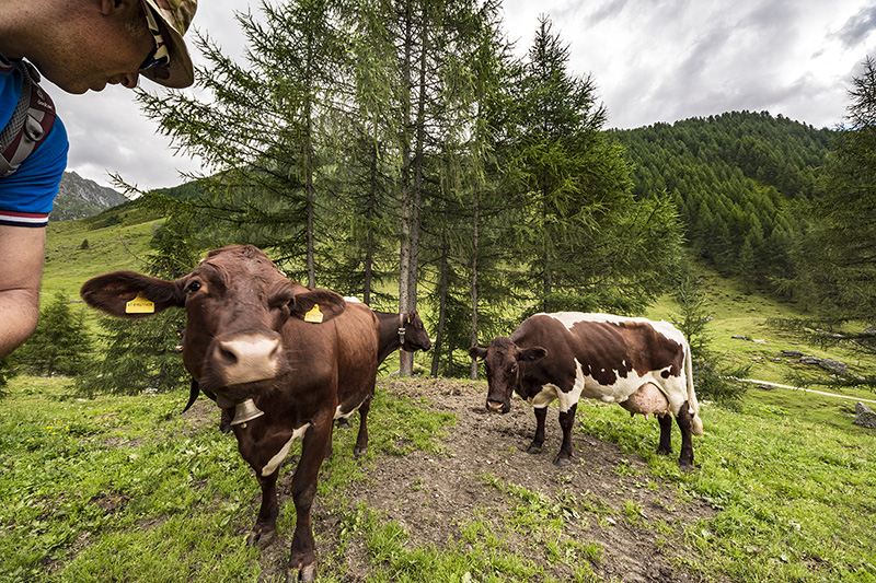 Usare l'8mm per uno scatto del genere (intendo a "cose" animate) rende la scena molto dinamica e divertente. La mucca lancia uno sguardo quasi minaccioso al turista che sembra esserle avvicinato troppo, mentre l'altra... l'altra osserva attenta la scena.