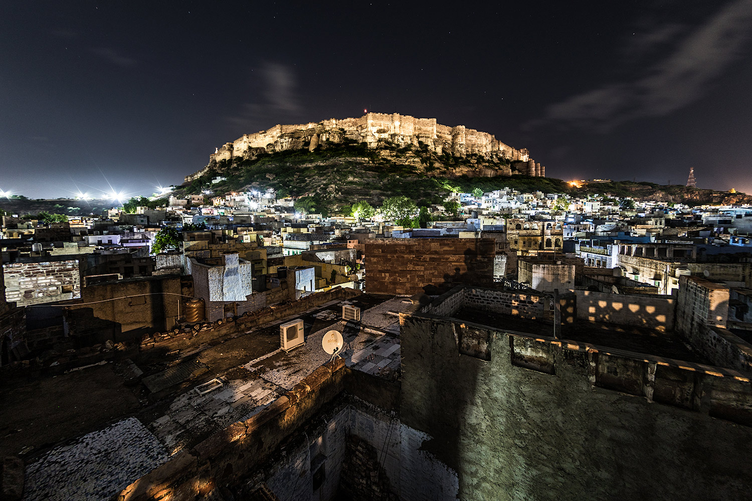 Vista notturna sul Forte Mehrangarh, a Jodhpur in India