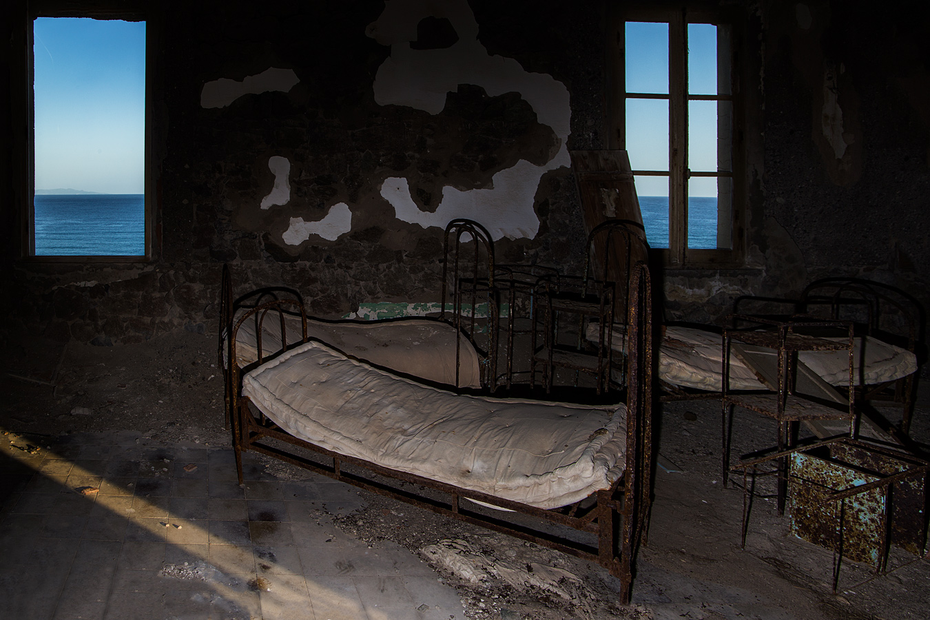 La bellezza e la quiete del paesaggio esterno contrasta con il degrado interno dove incuria e tempo hanno lasciato una inquietante patina.Eppure il mare è lì da milioni di anni e non invecchia!Ottimo il colore,necessario e ben dosato l'uso del flash.Complimenti! Ciao,Sergio. Smile