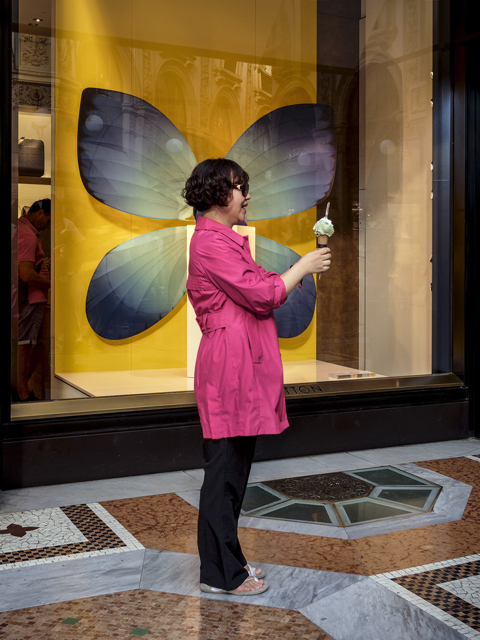 Una golosa Madama Butterfly in una luce molto bella che esalta colore e riflesso. Bellissime le macchie (? non so il termine) ottenute dai lampioni riflessi proprio come sulle ali delle farfalle. Non so se potessi farlo,a livello di formato, ma avrei eliminato l'uomo all'interno del negozio. Mi piace