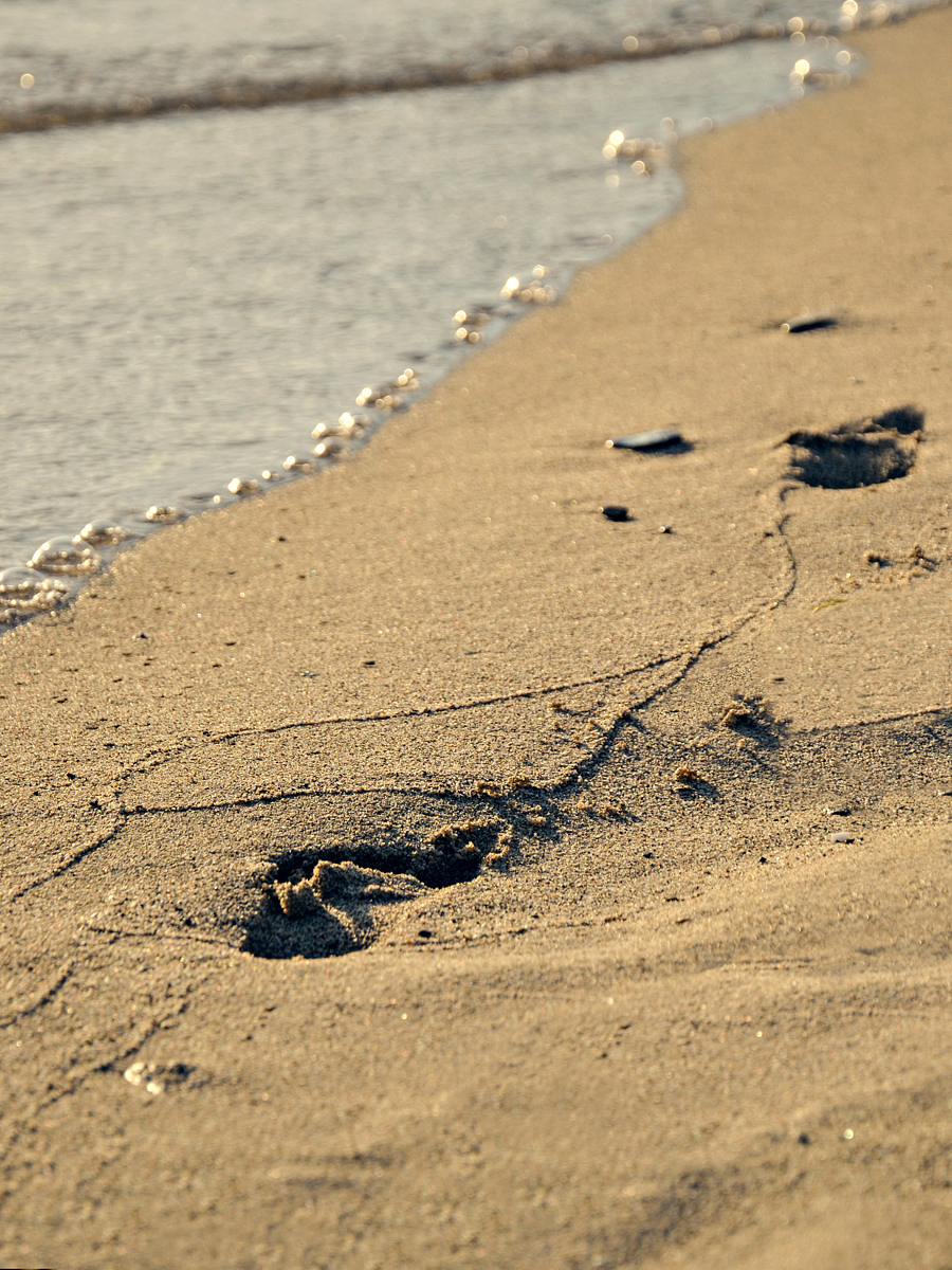 la foto: non noto dominanti, quella sabbia con quella luce è proprio così e la scelta di un fuoco selettivo vincente, lo sfocato a me rende ragione di quel senso di 'perdersi' camminando sulla riva nell'infinito parlare col mare .
