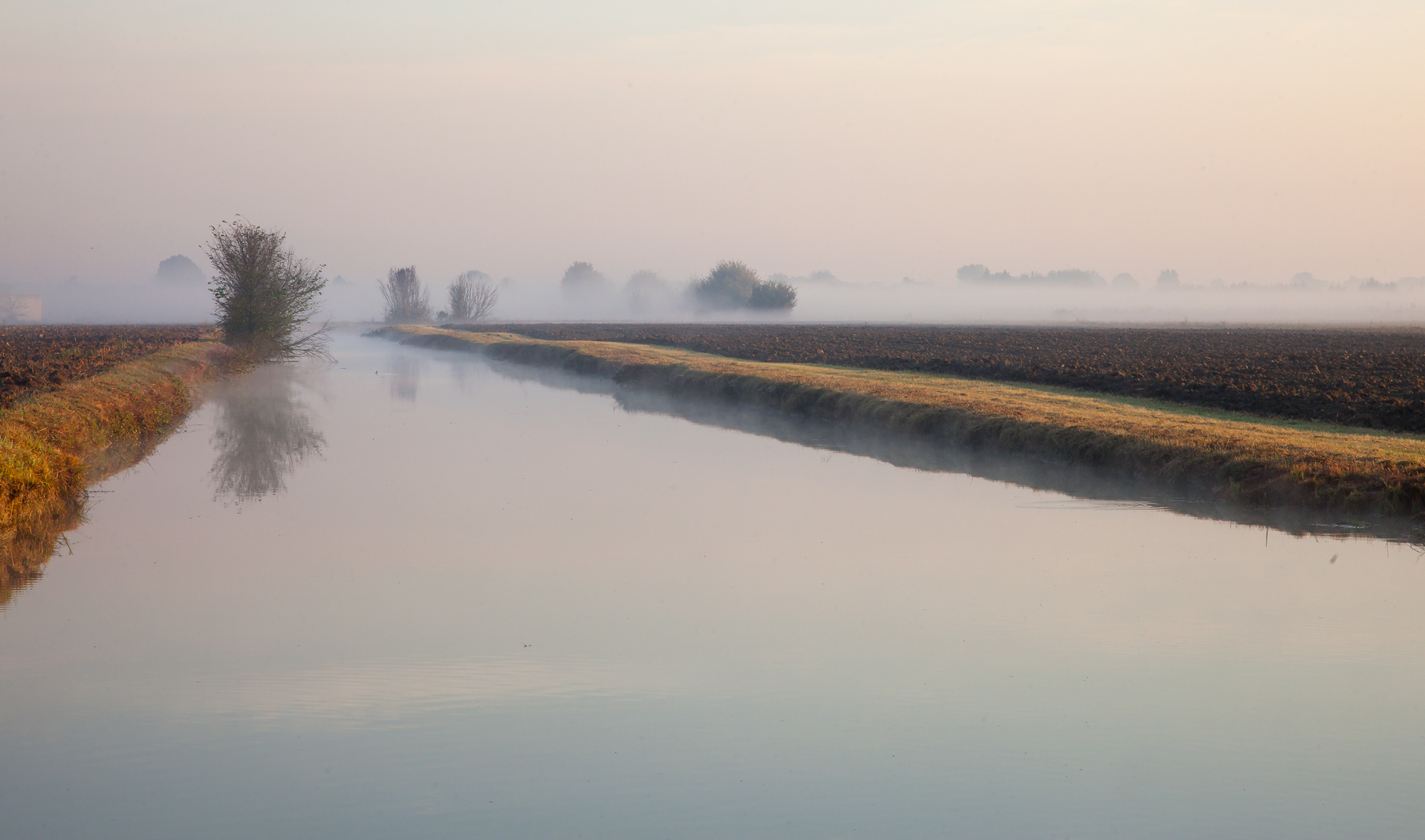 Una bella immagine,nel 1°Piano questo bel canale ben ripresae nella profondità la nebbia che si alza..Tutto molto bello Claudio.