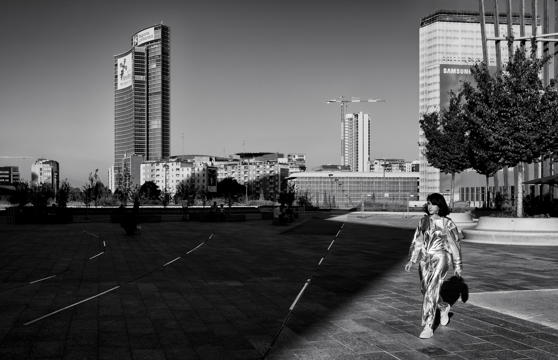 Un ritorno al futuro con questo ottimo bn dal sapore analogico e gli svettanti grattacieli dai richiami tecnologici.La figura umana con abbigliamento post moderno completa egregiamente la scena.Mi piace anche la composizione. Ok! Ciao Preferita.
