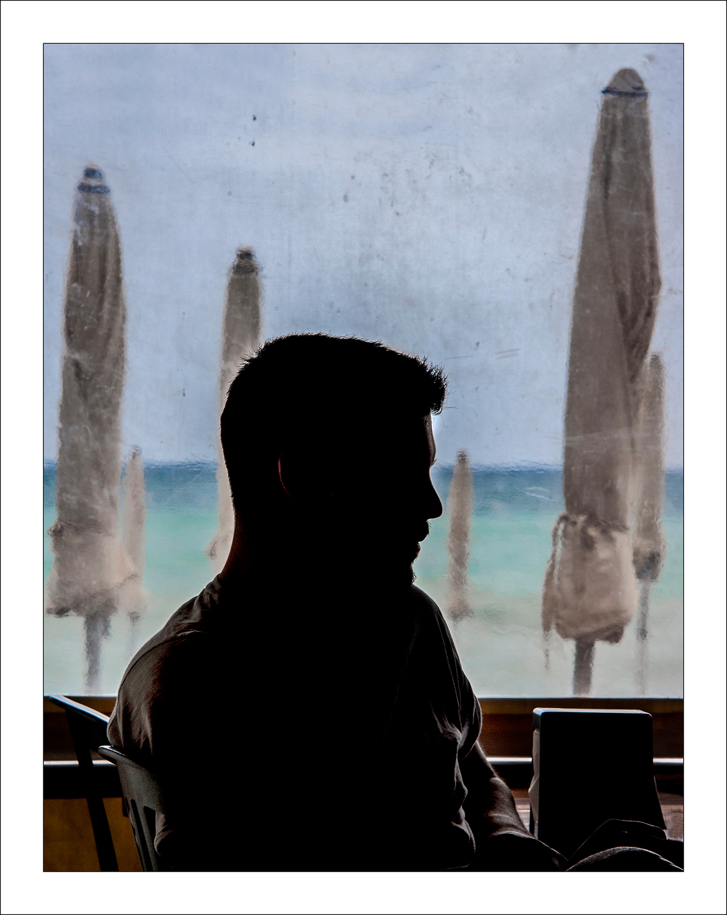 Lo sfondo di mare ed ombrelloni opacizzati dalla pioggia è emozionante, il profilo sottolineato dalla luce d'interni è internso. Un'ottima proposta, Bruno.