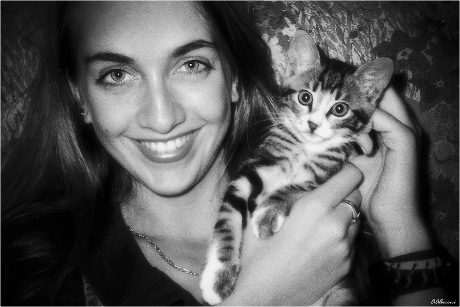 Mi piace perchè molto tenera. Solo i neri troppo chiusi e forse gli occhi del gatto non proprio a fuoco. Il flash così diretto ha un po' appiattito la scena  |