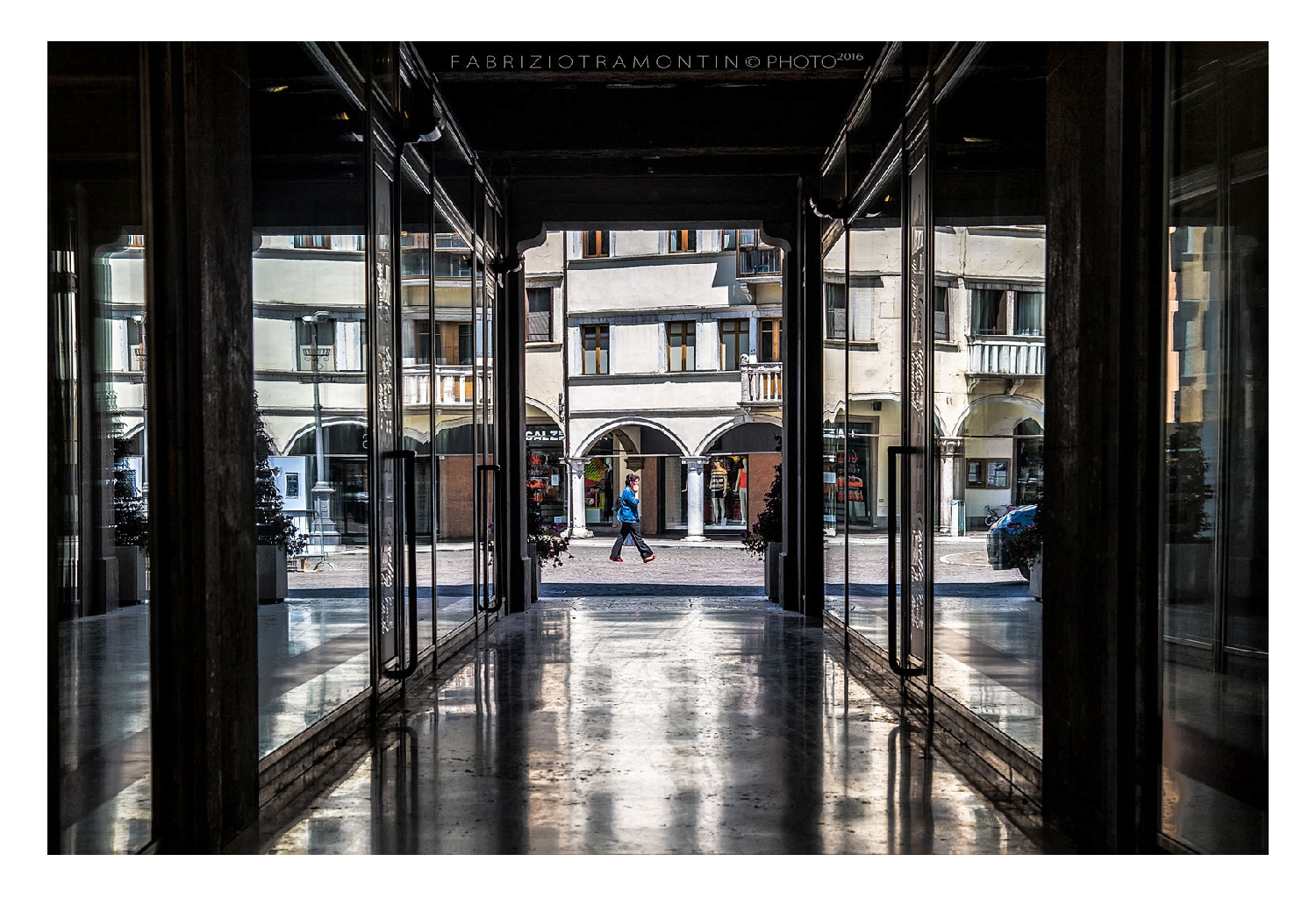 Questo corridoio di specchi che guida lo sguardo verso il passante è brillante e luminoso e ben condisce l'atmosfera. Una porzione di mondo quadruplicato (c'è anche il riflesso sul pavimento) e dal gustoso gioco visivo.
