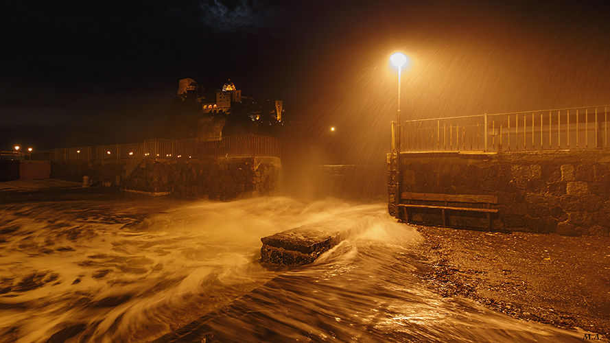 L'unico scatto fatto durante il maltempo di questi giorni. La dominante calda introdotta dalle luci artificiali mi creava una sorta di monocromatico naturale che esaltava la drammaticità della scena e quindi ho gestito i colori senza eliminarla, dato che era proprio il risultato che cercavo. La reflex e l'obiettivo erano tropicalizzati, io no e quindi mi sono fatto un mezzo bagno