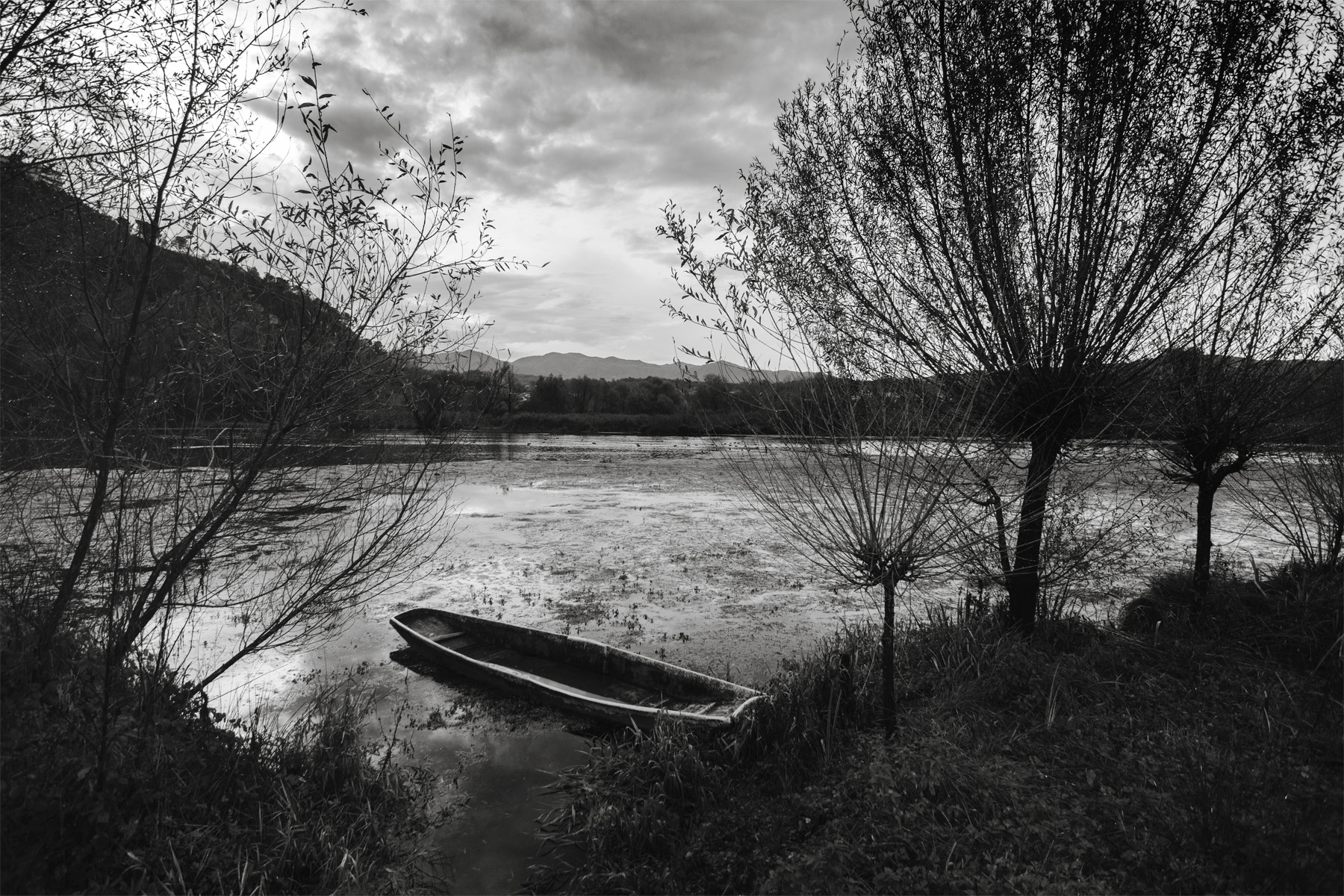 L'atmosfera l'hai saputa cogliere perfettamente Giò. il bn è assolutamente idealizzato con questo paesaggio che, diversamente, avrebbe detto e trasmesso altre cose. Tenebre ben interpretate con questi rami spogli che vanno a incrociarsi con i nuvoloni neri. La barchetta è l'unico segno della presenza umana.