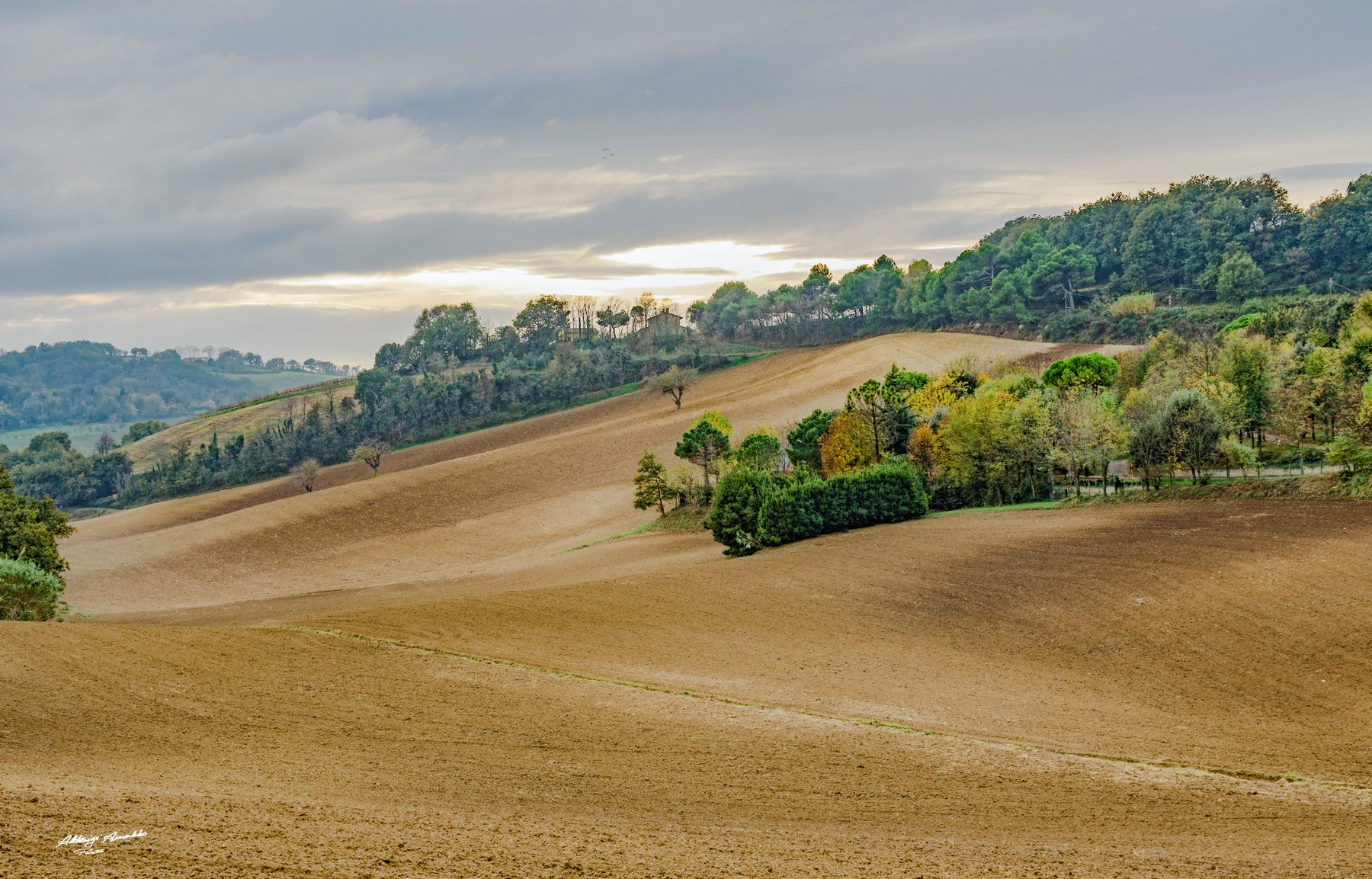 La scena di questo campo collinare lavorato di per se non sarebbe male, si seguono piacevolmente le curve del paesaggio. La pp, sui verdi spinti e l'appiattimento delle ombre, invece non la gradisco in pieno.