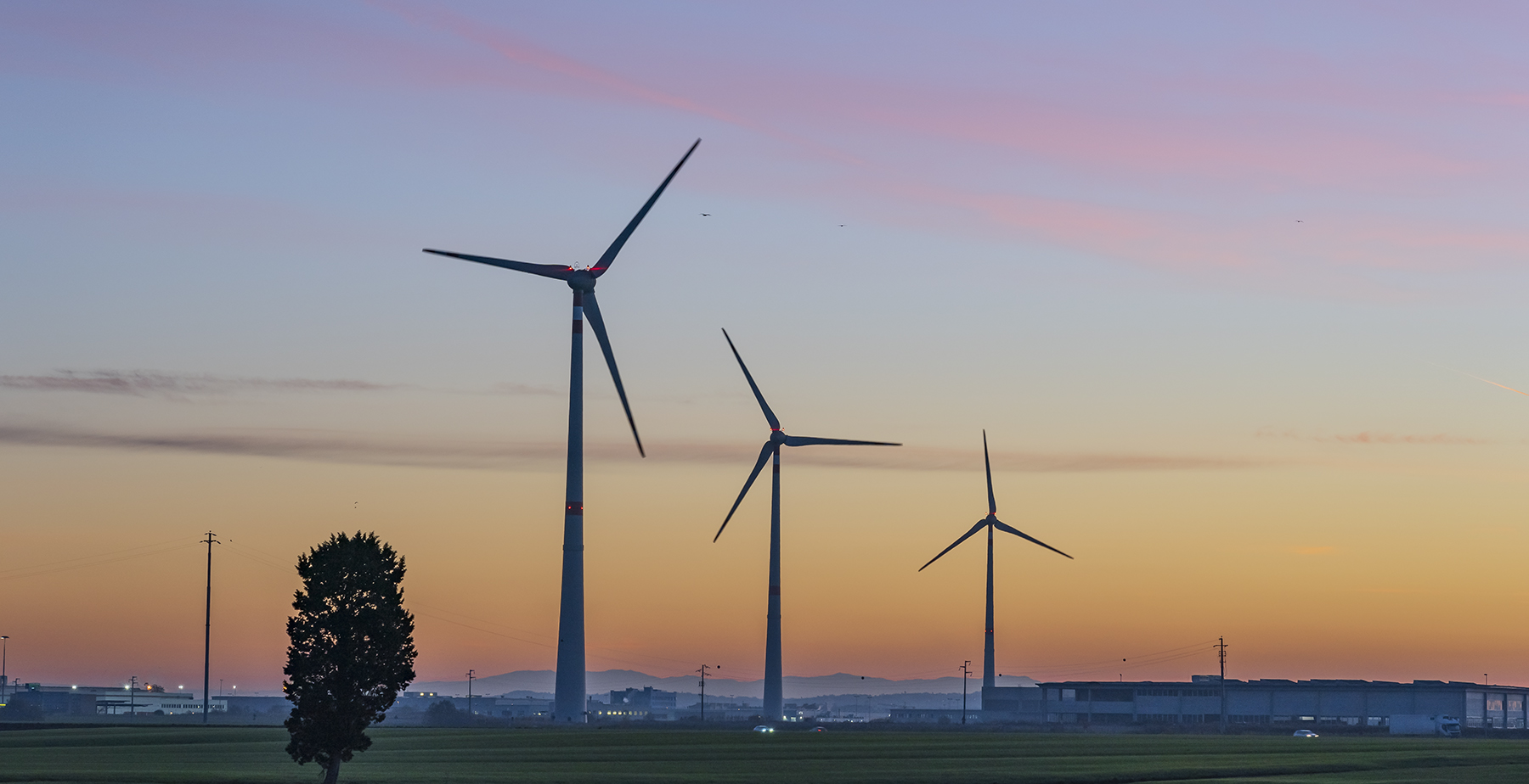| I colori dell'alba, le pale e quell'albero solitario; la natura, complice silenziosa dell'opera dell'uomo, che giganteggia. |