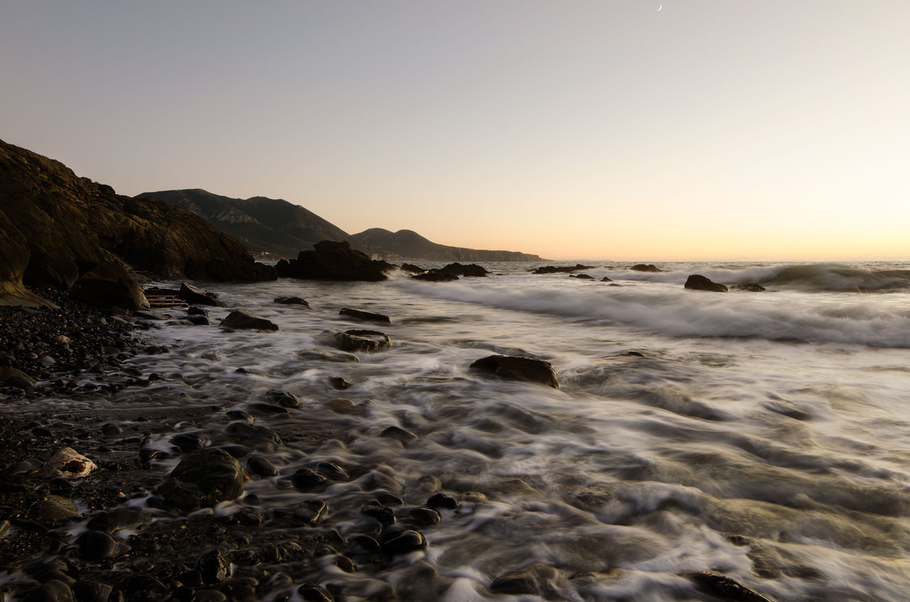 un bel paesaggio direi. Ci sono due fattori in questo scatto che gli donano coerenza ed efficacia.. Il mosso controllato delle onde. Il primo piano perfettamente leggibile ed a fuoco. Le direttrici presenti che costruiscono la composizione della scena, ossia la costa rocciosa e l’orizzone “racchiudono” e delimitano un settore della scena che risulterebbe alquanto vuoto. Tu invece hai voluto inquadrare tutti i ciottoli in primissimo piano con il loro fondersi (andando in là) con l’acqua mossa e spumeggiante, ed ancora dopo ci sono le onde spumose che rompono la monotonia dell’acqua. Insomma, cosi’ non ci sono zone vuote o piatte. Complimenti per non essere caduta nella tentazione di allungare i tempi per avere il mare “setoso”; in tal caso avresti perso tutti gli elementi oggettivi che riempiono la scena. Adottando un tempo breve ma non troppo sei poi riuscita a rendere efficacemente l’idea di movimento dell’acqua. Se proprio devo trovare qualcosa di migliorabile direi di tagliare una fetta superiore di cielo. Esso risulta troppo vuoto, e secondo me, l’immagine ne guadagnerebbe.