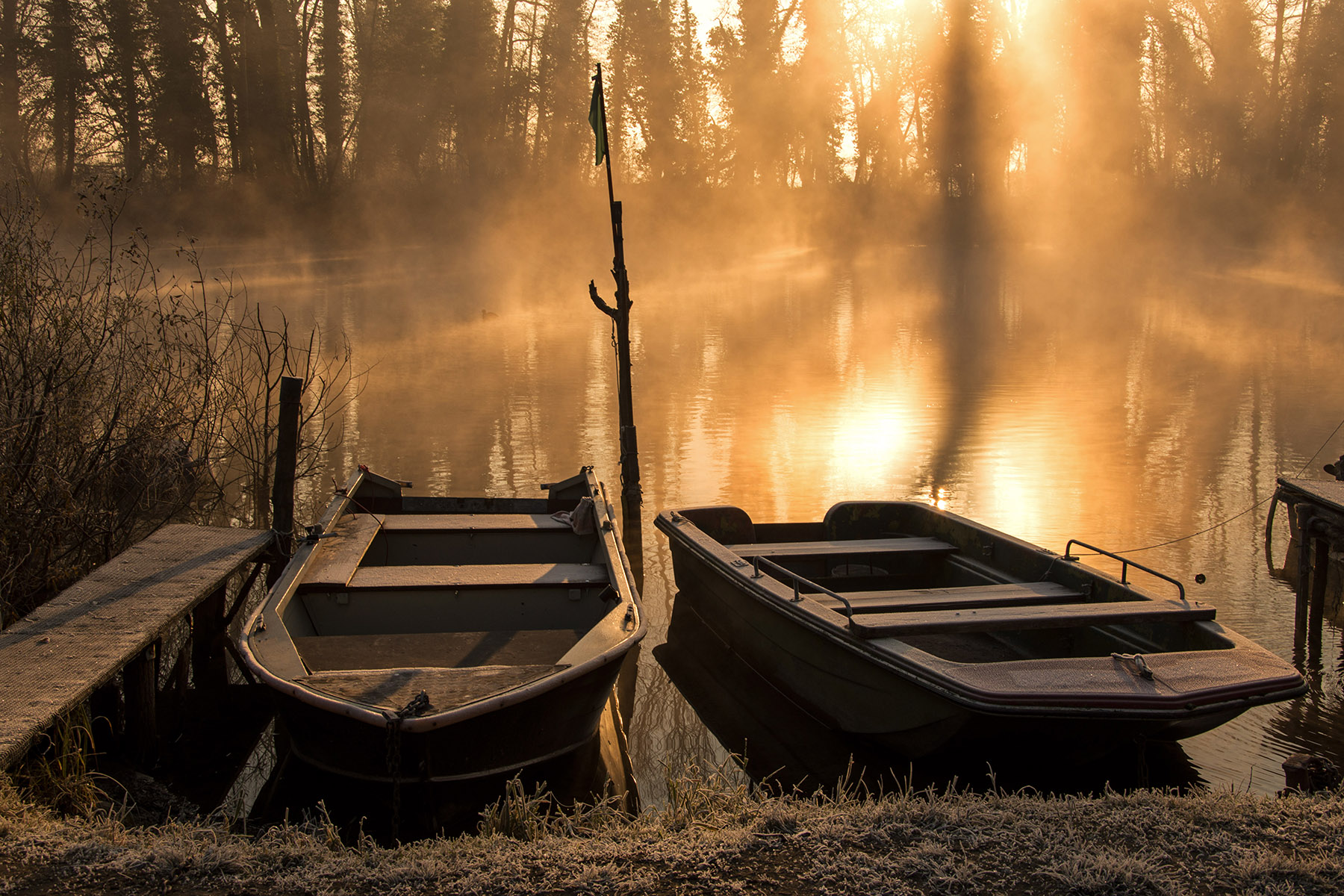 Luce dorata che attraversa gli alberi e raggiunge le due barche. Antonio |