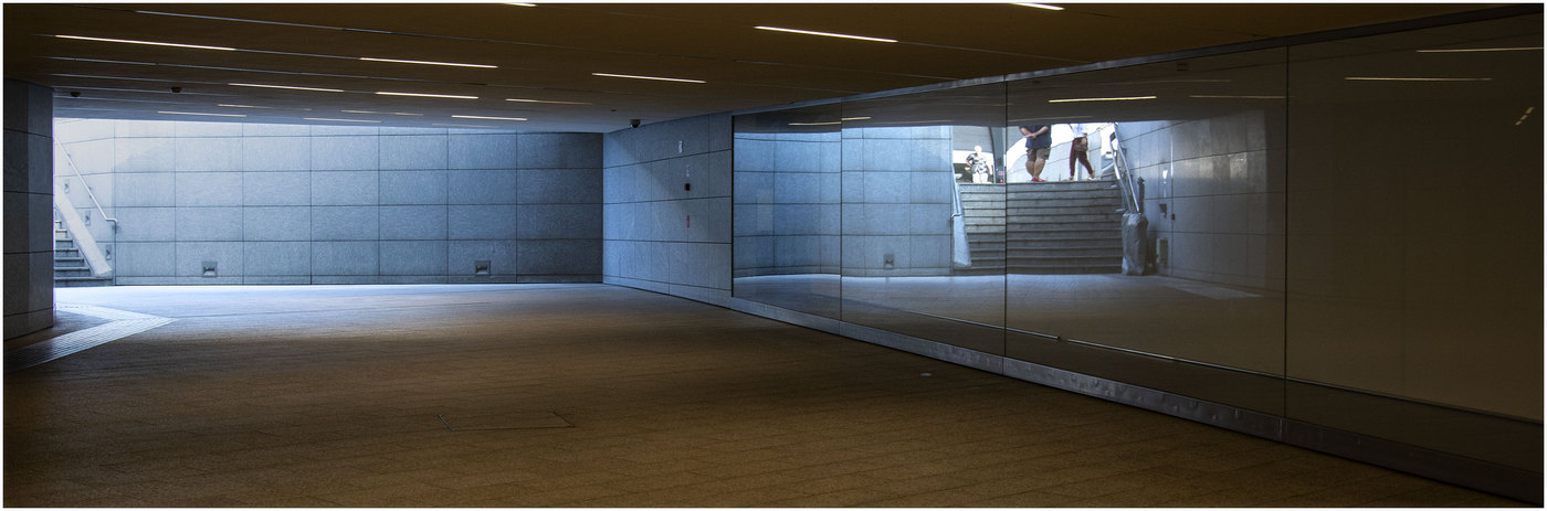Taglio ultrapanoramico che mi piace molto e rende perfettamente l'idea di trovarci in un sottopasso o altra struttura bassa e larga. Mi piaceanche come hai composto sfruttando il riflesso della scalinata.