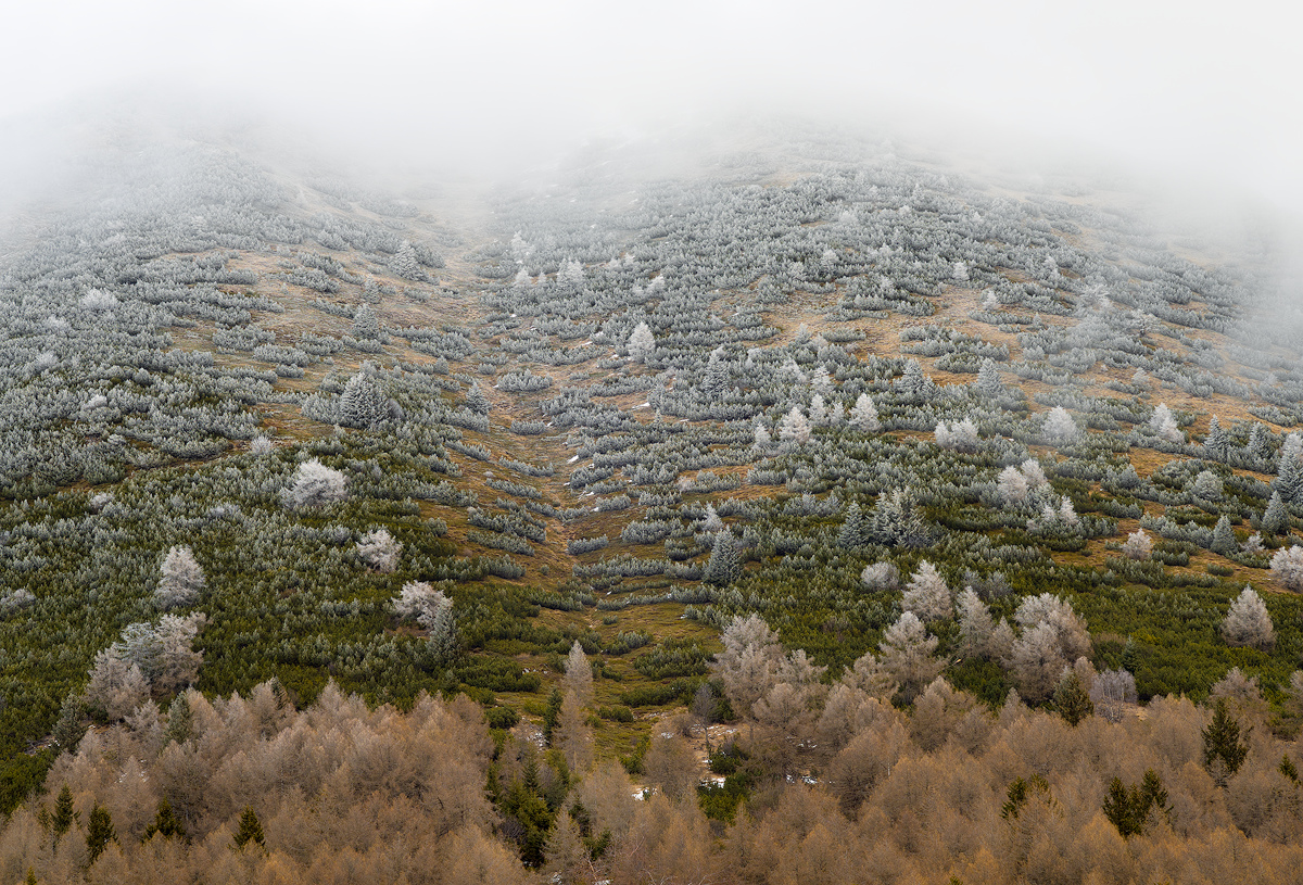 I nuovi abeti ? O è il pino mugo ?? Bella la galaverna sui rami..Sembra una texture ! _________________ "Fotografare mi serve a non morire"