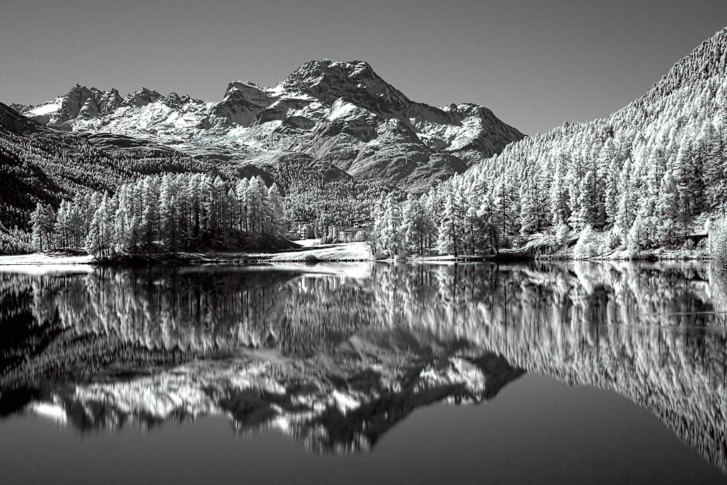 In realtà si tratta certamente di autunno. Nella fotografia all'infrarosso infatti vengono riprodotte con tonalità di grigio chiaro o addirittura di bianco le aree dell'inquadratura che emettono grande quantità di radiazioni infrarosse. Le zone di foglie e di erba tipicamente sono forti emettitori di infrarosso e di conseguenza appaiono in fotografia molto chiare. Perciò, anche se guardando questa foto istintivamente pensiamo ad un paesaggio invernale, con gli alberi e i prati coperti di neve, in realtà i prati sono certamente ancora verdi, e gli abeti NON possono essere coperti di neve.