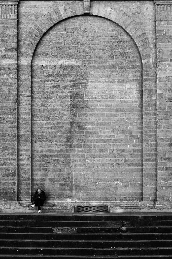 Poteva essere un puro esercizio di geometria, ma la presenza dell'uomo (minuscola di per sé nelle proporzioni con l'architettura, ancor più per la posizione come "accartocciata" su se stessa) gli dà una spinta che risolve la foto, proponendo il confronto tra monumentalità e umanità.