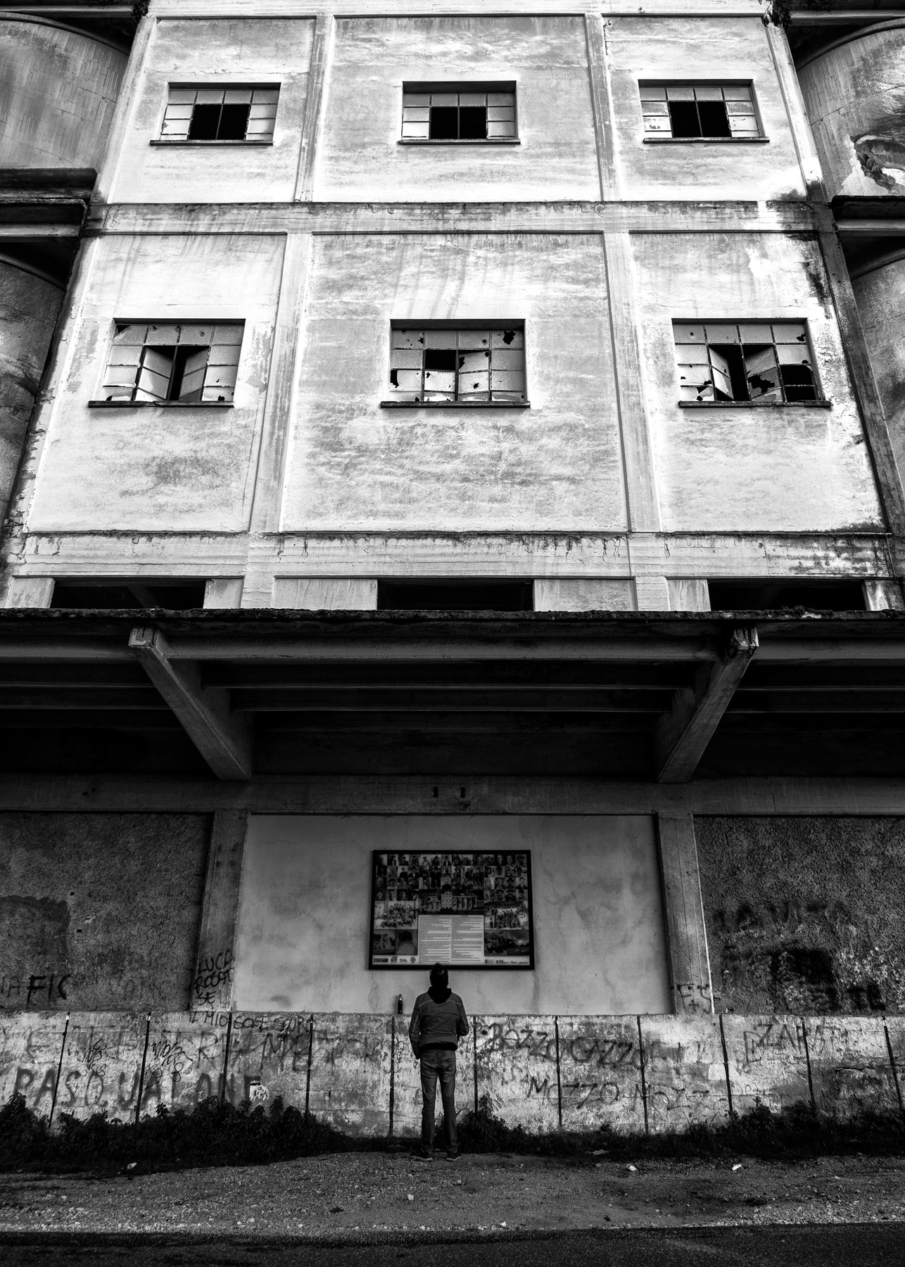 In ambito architettonico e giudicando solo la correttezza direi che è una foto sbagliata......eppure è questo suo essere non formalmente corretta che la trasforma in uno scatto non banale ma sopra le righe. l'edificio cosi' reso sembra in bilico per travolgere la persona ai suoi piedi. Buona la scelta del B&N, niente colori (che non avrebbero aggiunto nulla di essenziale) ed attenzione su masse, forme e situazione.