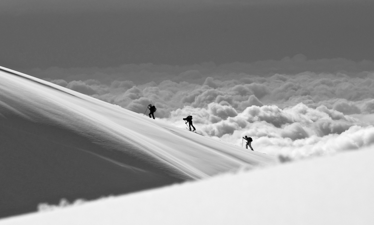 molto bella anche questa coni tre scialpinisti che procedono a fatica ed emergono da un mare di nuvole.