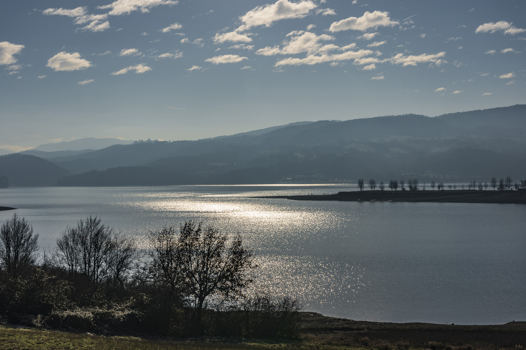 Bellissima ripresa, e quella luce che rispecchia nell'acqua tanto da far apparir dell'argentatura al centro della diga.. Buona serata.