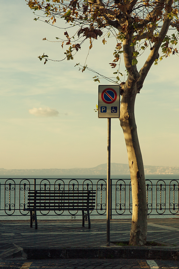 Quasi i due protagonisti verticali, palo e albero, si avvicinano e quasi si toccano, intorno il vuoto, quella panchina che attende da un momento all'altro magari una coppia di innamorati, intanto inganniamo l'attesa con i due di cui sopra, mood proprio dell'Autore, assenza-presenza, con vista mare. Molto bella. Ciao