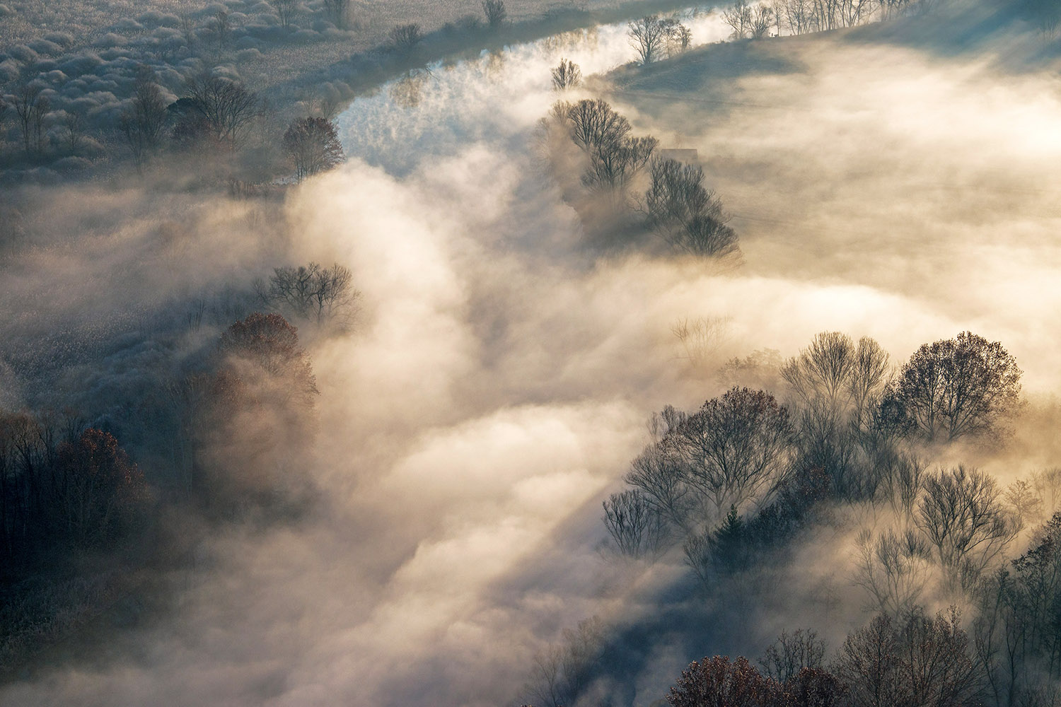 Luce radente sugli alberi e nebbia che sembra ribollire, ottima!complimenti Elis!
