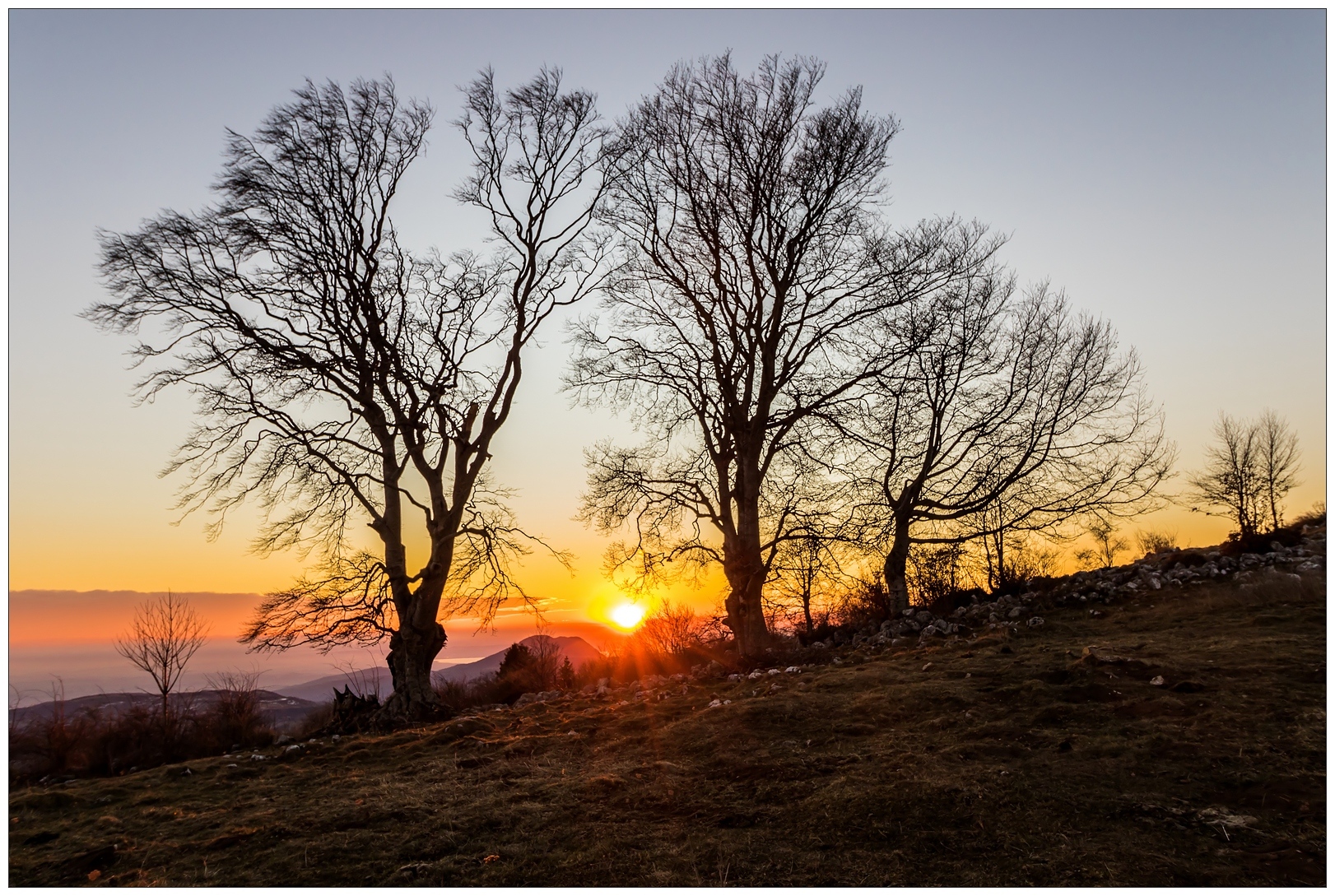 E' un tramonto dai primi contrafforti della lessinia veronese; la ai piedi del faggio di sinistra si intravvede pure il lembo meridionale del lago Garda distante almeno una trentina di km.