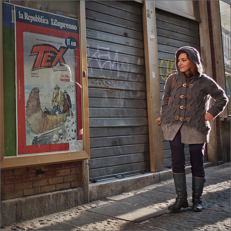 Grazie Arnaldo,Harma e Bruno per i graditissimi commenti.Cercavo un soggetto che potesse contrapporsi con la sua normalità alla vita avventurosa di Tex,ho visto un signore venire da un vicolo laterale con la sua borsa da impiegato ed ero pronto a scattare,contemporaneamente,con la coda dell'occhio ho visto che dal lato opposto entrava in scena lei e rallentava il passo avanti al manifesto.Indeciso su quale soggetto escludere li ho presi entrambi anche se lei al limite,il processo mentale è durato un attimo.In post poi il sorriso di lei verso Tex ha avuto la precedenza.Mostro la foto con l'uomo,mio primo soggetto,ed il fotogramma completo.Un caro saluto,Sergio.